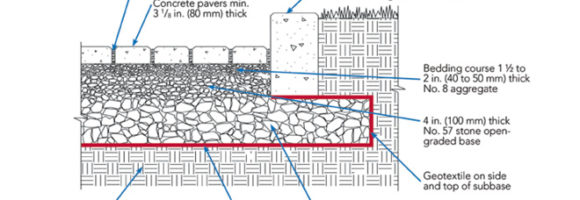 Figure 3 illustrates a typical application of geotextile in PICP. Its application against the sides of the subbase and against the excavated soil is essential in all PICP projects that do not use full-depth concrete curbs to completely confine open-graded aggregates at the pavement perimeter. The design and selection of geotextiles for PICP is covered in detail in the ICPI manual, Permeable Interlocking Concrete Pavements – Design, Specification, Construction, and Maintenance.